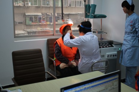 西安新城中大耳鼻喉医院耳鼻喉医生正为环卫工人做详细检查