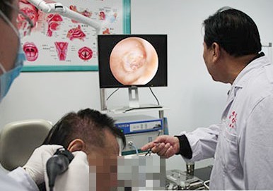 图为:西安新城中大耳鼻喉医院医生在为患者检查耳部