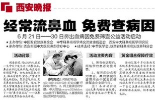 国外调查表明,在整个人群中,约60%的人在其一生中至少曾发生过一次鼻出血。鼻出血不仅发病率高,而且可对机体造成严重损害,如失血性贫血、休克、脑血管意外、窒息,严重者可有生命危险。夏季空气干热,更是鼻出血的高发季节。为此,中国五官健康基金会联合西安晚报、华商报、西安新城中大耳鼻喉医院共同发起了一场“鼻子保卫战” ——流鼻血病因免费筛查公益活动,为保卫我们的鼻子而共同战斗。