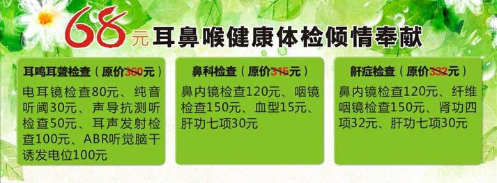 为了让广大市民朋友的健康,西安新城中大耳鼻喉医院特推出“暑期耳鼻喉优惠健康体检,68元任选耳、鼻、喉三大套餐之一”的优惠活动,活动有效期从即日起至2013年8月31日止,其中耳鼻喉具体详细检查如下: