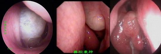 3、粘液性息肉,颇似剥皮葡萄状或鲜荔枝肉状,表面光滑半透明,呈粉红色,有细带多来自中鼻道,触之柔软活动。