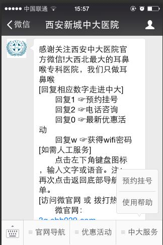 据悉,西安新城中大耳鼻喉医院是西安市首家与腾讯微信合作的医院,同时也是西安市首个开通微信支付的医院。截至目前,微信智慧医疗解决方案已经覆盖的地区包括北京、上海、广东、江苏、浙江、湖南、湖北、四川、重庆、云南、海南等地,近100家医院上线微信全流程就诊,超过1200家医院支持微信挂号,服务累计患者超过300万。