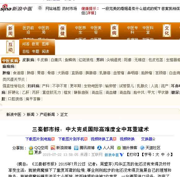 (摘自:三秦都市报2015年7月22日 记者:周盟芽)风华正茂的他还没有来得及好好享受生活,就被病魔推下了重度耳聋的险境;事业刚刚起步的他还没来得及施展自己的理想和抱负,就被病魔纠缠奔波于大小医院;然而绝望的他被7位医生、一台进口设备,改变了命运……