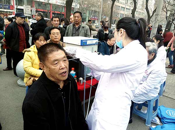 本次义诊医护志愿队伍由西安新城中大耳鼻喉医院内科医生孙连玉主任带领。早上9点,在莲湖区青年路街道莲湖公园,医护志愿队已经搭好了义诊台,开始为市民检查身体。很多市民马上聚拢过来,争相咨询病况。