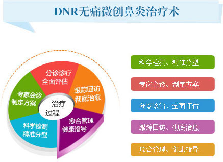 DNR无痛微创鼻炎治疗术是利用数字智能识别功能先采集治疗组织数据,使组织瞬间产生蒸汽,在数字高频交变电场的作用下,在低温的情况下使病变组织迅速消融及血管收缩、封闭。由于工作温度超低,消融深度可以精确控制,而且采用比人体头发丝还细小的切割弹 头,所以手术过程对周围组织的损伤很小。